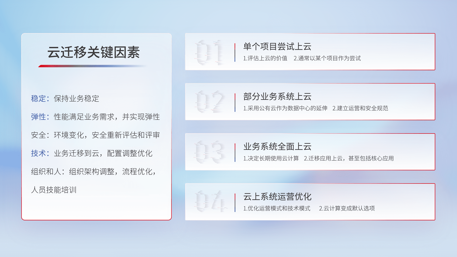 结合实际业务,,从规划设计、、云平台选型、、云原生改造、、、、数据迁移、、、、集成交付,,迁移全过程为客户识别最佳上云路径,,,,做好风险识别管理,,设计网络架构、、、身份权限、、、安全审计合规、、、、操作审计、、日志审计、、监控告警策略、、、、多站点容灾设计等,,对云上基础设施进行整体规划,,提升IT治理水平,,以满足弹性、、、、高可用、、高性能的需求。。。